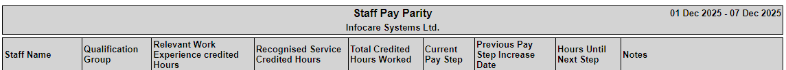 The Staff Pay parity report will provide a summary of staff and details about their pay step progression.