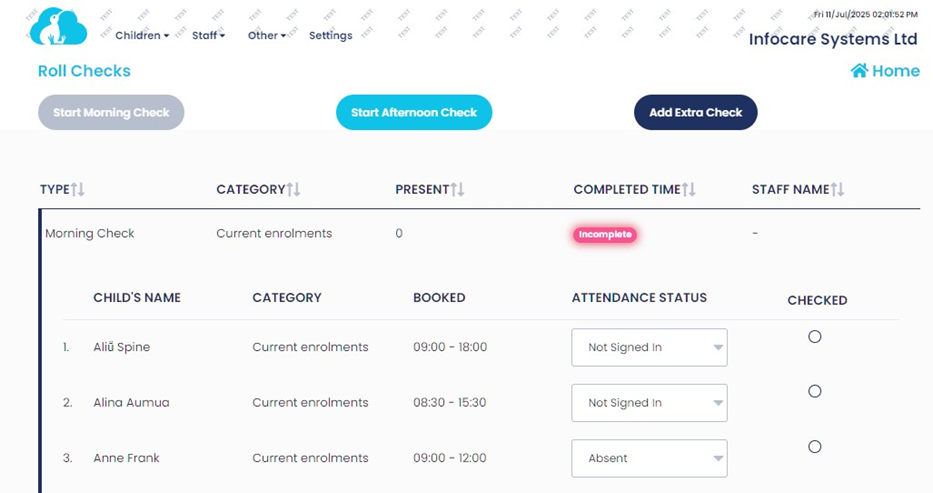 Select applicable Roll Check to mark the roll for the AM Check, the roll can be marked by selecting the "checked" radio button for each child, alternatively all children can be marked present by selecting "check all" at the bottom of the screen.